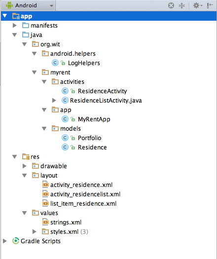Our current version of MyRent (V01) only permits a single Residence to be entered. In this lab we seek to manage a list of residences. To do this we need to extend the model by including a new class - 'Portfolio' - to manage all our residences. We will also need a new Activity - ResidenceListActivity - to display the full portfolio of residences.