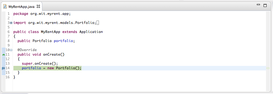 Run the app now, and place a breakpoint in the onCreate method. If the app stops at this point, then you have successfully introduced an application object.