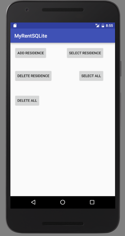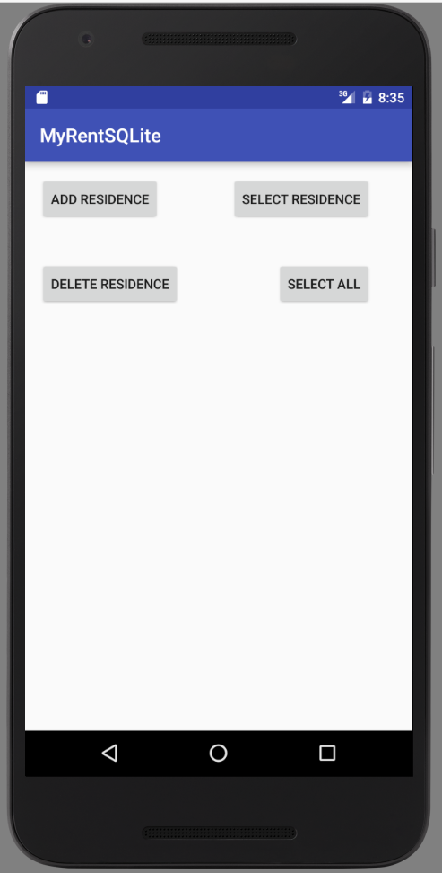 It's important to note that the name of the folder containg the database, sqlite.myrentsqlite , derives from the package name in the AndroidManifest.xml file and that the name of the database, residences.db, is that which we have assigned in DbHelper.java. The table, tableResidences, will also have been assigned in DbHelper.